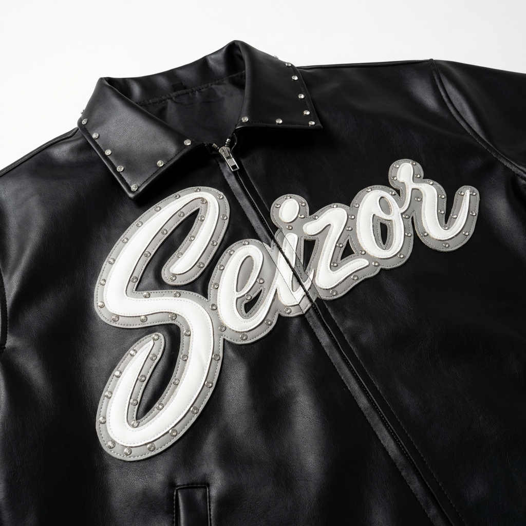Details: Individually hand-placed stones, leather-on-leather Seizor script stitched directly onto jacket